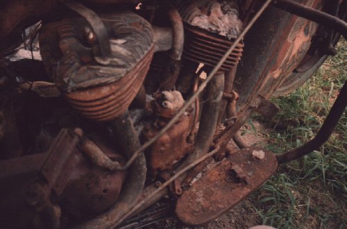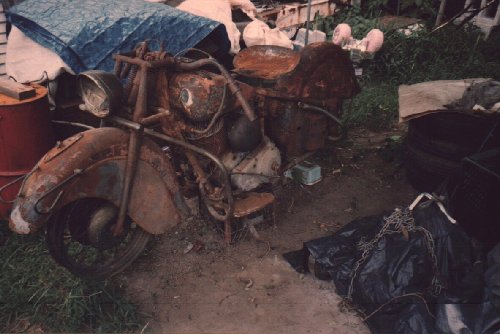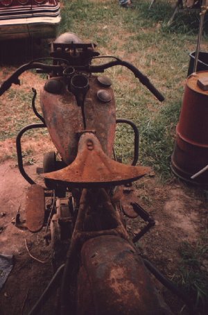 So as I'm gawking at these two utter wrecks, something strikes me. "Didn't you say you rescued three bikes?" "Yep. Check this out." Paul then leads us into a 10ft by 10ft shed next to the tarp where we see a chassis up on a stand that is absolutely perfect. Not perfect as we normal humans understand it, but perfect like the guys in Springfield envisioned when they first conceived of the chief. What I want to know is, how do you refab metal where there is none, or it's burned clear through, or it's as thin as paper? There's but a foot or three of space on either side of the bike, but you can tell a lot of time had been spent in there. I don't even think it was heated. |